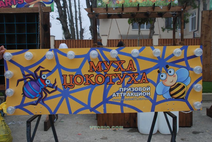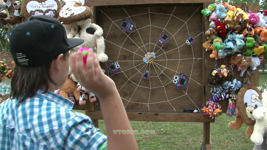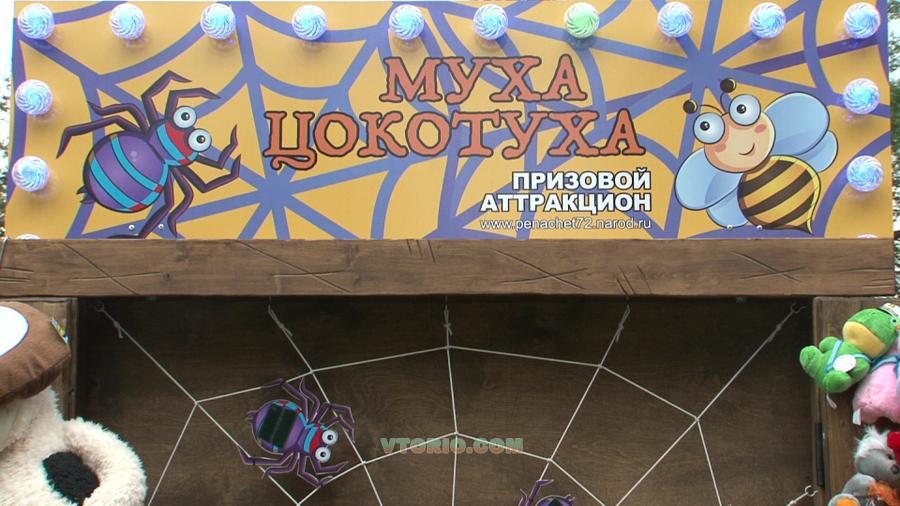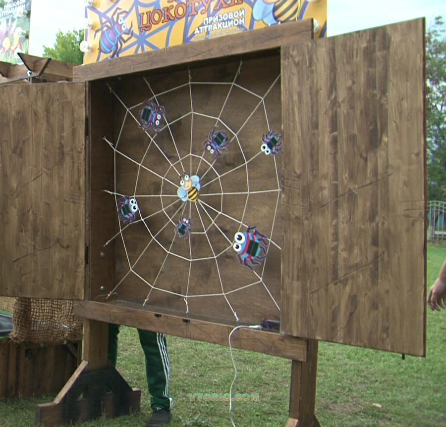 Мы приготовили очередной подарок для растущей армии поклонников Экостиля - Призовой аттракцион Муха-Цокотуха: НОВИНКА сезона - Осень 2013г. Очень проста игра, относиться к бросковой тематике, создана по одноименному мотиву сказки "Муха-Цокотуха". В середине путины находиться Муха-Цокотуха, вокруг нее злобные пауки. Задача игрока попасть в пауков мячиком или подушечкой, на пауках и мячиках прикреплена липучка. При попадании мячиком в брюшко паучка мячик цепляется за липучку и попадание засчитано. Дальше все просто: шесть бросков - шесть результативных попаданий и приз в руках счастливого победителя! Попали 5-4 раза из шести попыток, то средний приз, ну и все остальные результаты попадают под категорию утешительного приза. За время тестирования больших призов было разыграно мало, очень-очень мало. Ну так никто и не обещает игроку что все будет так просто!