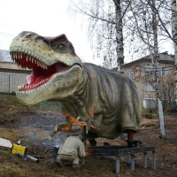 Сейчас в пойме реки Балакиревицы красуются уже пять ящеров. Шестой, самый большой, тиранозавр на подходе. Напомним, что всего в Котельнич привезли 18 фигур, если быть точным, то 14 групп (в некоторых композициях задействованы по три скульптуры). Некоторые динозавры приехали «травмированные» - у кого хвост отпал, у кого зуб.