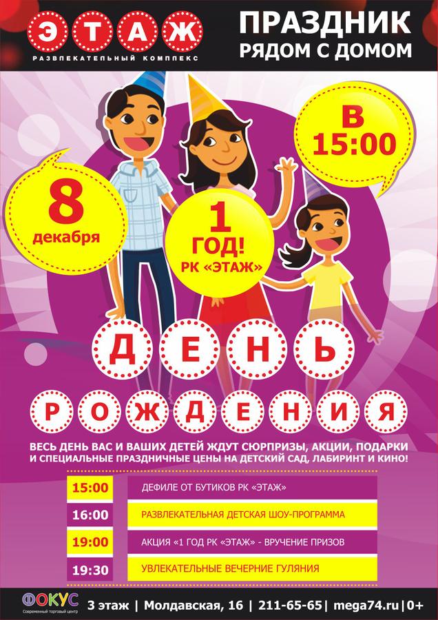 В субботу, 8 декабря, развлекательный комплекс «Этаж» в Челябинске празднует свой первый День рождения. Весь день на третьем этаже ТРЦ «Фокус» пройдут мероприятия, посвященные празднованию первого года.
