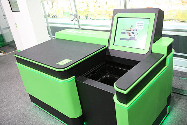 Товары в корзине сканируются одновременно, что значительно увеличивает скорость обслуживания. Затем товар оплачивается покупателем на специальном терминале. "Магазин Будущего" принимает к оплате наличные средства, кредитные карты и платежи c использованием бесконтактных технологий, в том числе телефонов с NFC.