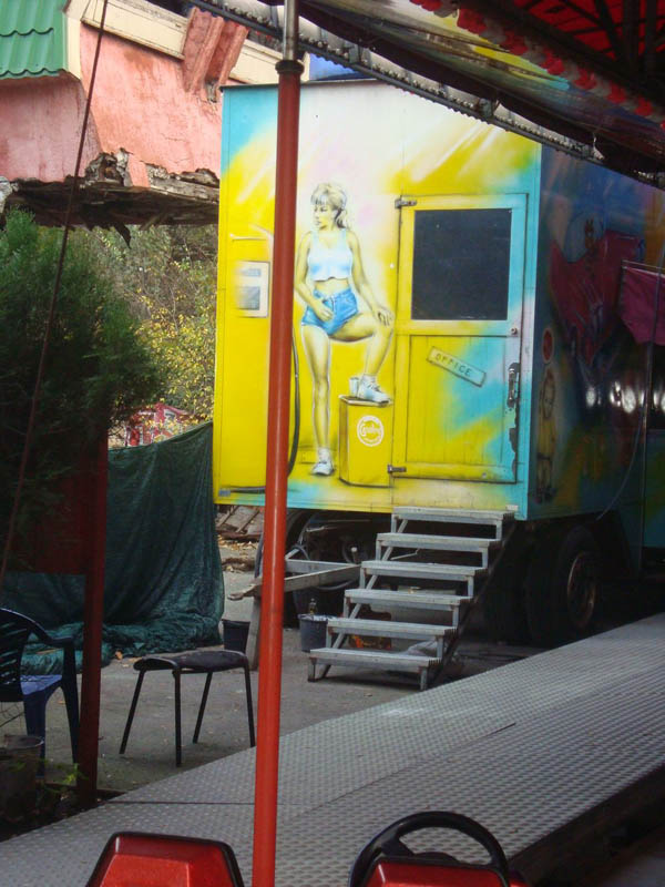 Аттракционы и трейлер, их обслуживающий, расположены в парке им. Горького, за кинотеатром «Москва». Стоит сказать, что изображения находятся не на самом видном месте.