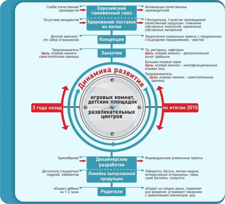 Однако 3 года назад ситуация была иной. Изменился рынок. Во многом, благодаря внешним факторам. Влияние Евразийского таможенного союза и удорожание поставок из Китая – активизировали отечественных производителей. Повышение конкуренции способствовало улучшению качества производимой отечественной продукции. За 3 года изменились технологии и используемые материалы. В целом, изменилась концепция. Вернее, она появилась. 3 года назад детский комплекс представлял собой набор аттракционов. Сегодня это тематические уникальные проекты с продуманным «сценарием передвижения детей в комплексе» - квестом.