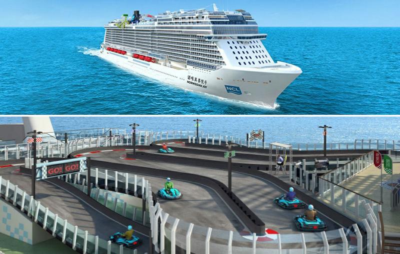 Норвежская судоходная компания Norwegian Cruise Lines презентовала проект нового круизного лайнера Norwegian Joy, на верхней палубе которого проложена двухуровневая гоночная трасса.