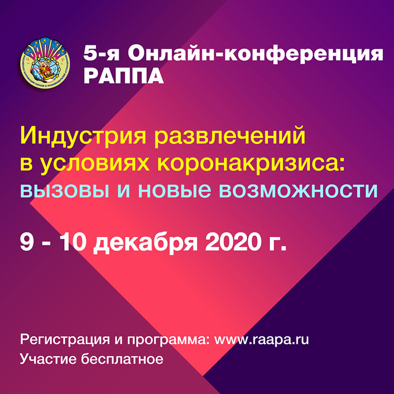 9-10 декабря 2020 года Российская ассоциация парков и производителей аттракционов (РАППА) проводит 5-ю онлайн-конференцию «Индустрия развлечений в условиях коронакризиса: вызовы и новые возможности». В ходе мероприятия специалисты обсудят новые условия работы предприятий индустрии развлечений в период и после пандемии, а также, какие изменения сегодня происходят в развлекательной отрасли и тенденции развития. С докладами выступят эксперты из России, Финляндии и США.