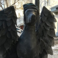 Скульптура в виде собаки в шапке и с крыльями и котенка установлена на пересечении улиц Баумана и Кави Наджми.