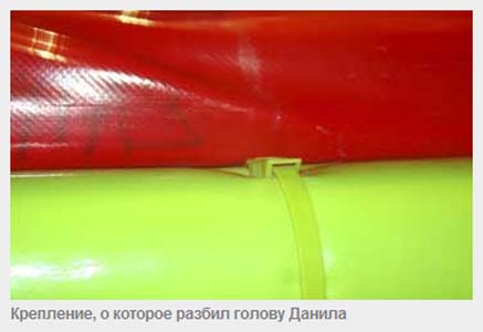 Наталья рассказывает, первую помощь малышу пришлось оказывать самим. Эти фотографии сделали посетители центра. Вот об это крепление Данила и поранился. В огромном торговом центре медпункта не оказалось. Медсестра же, по словам Натальи, пришла спустя почти час.