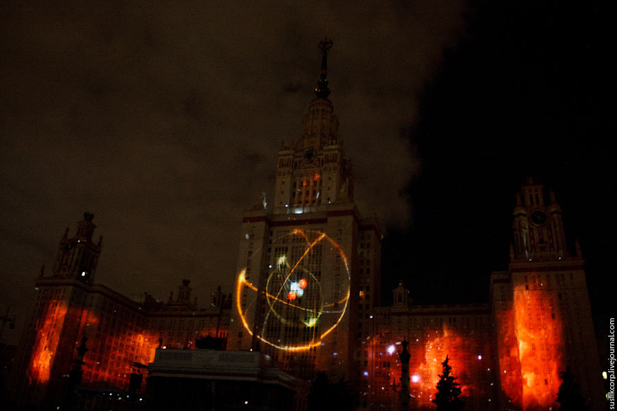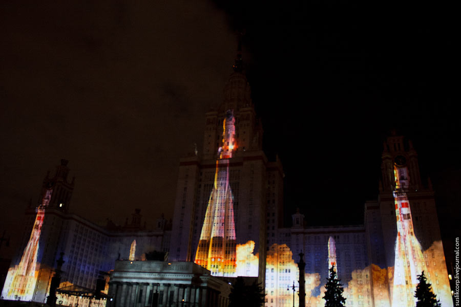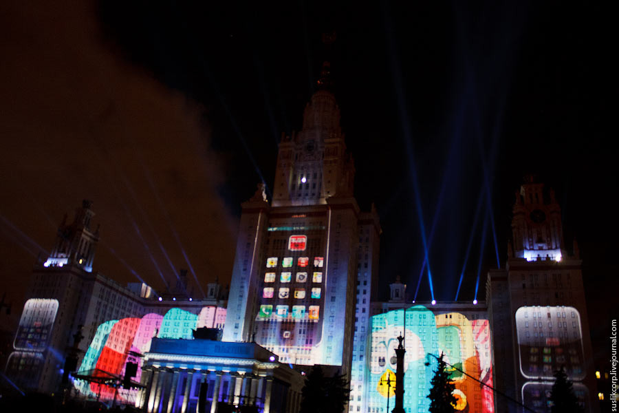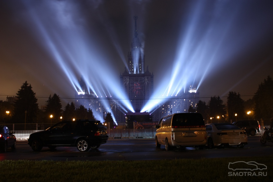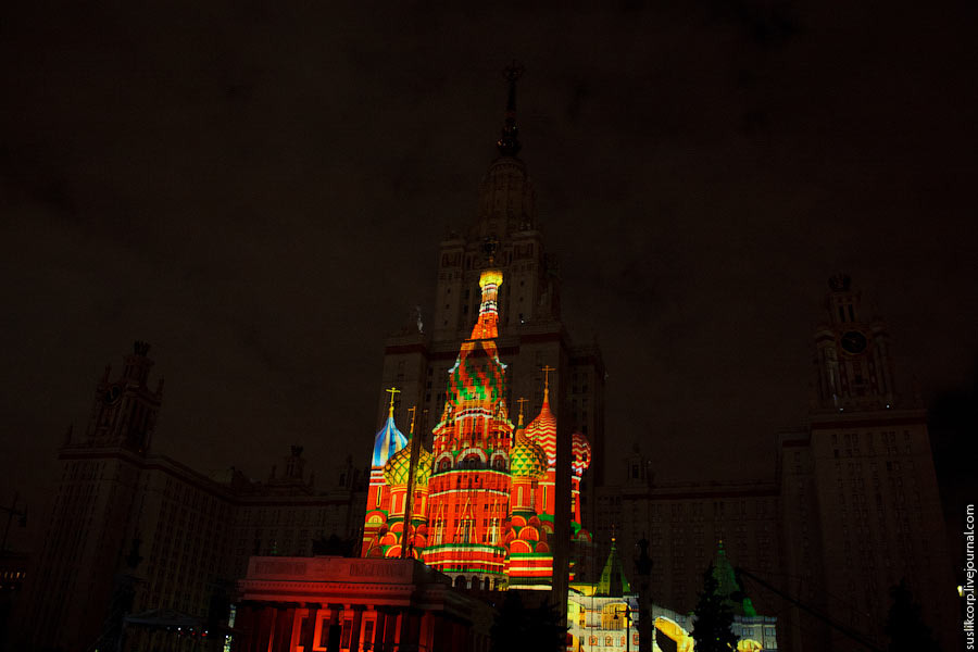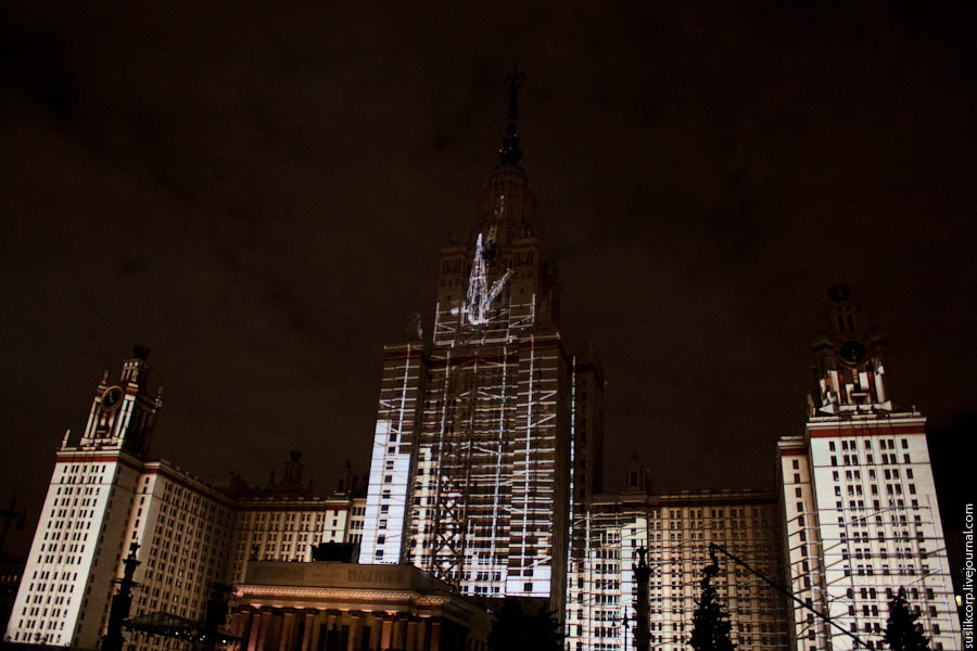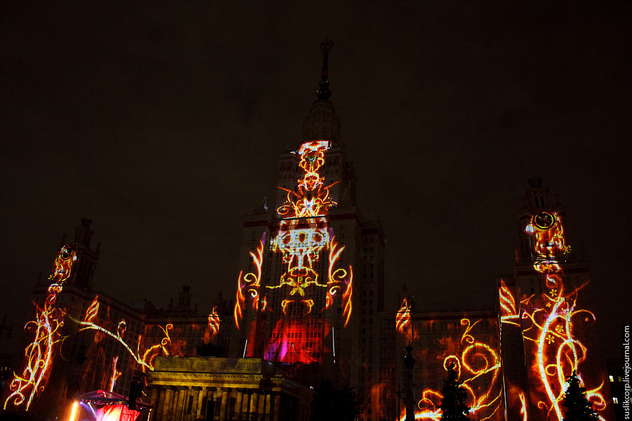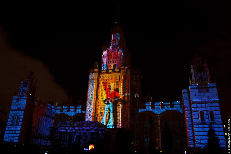 Например, так: чтобы всем зрителям от здания МГУ до Смотровой площадки было не только одинаково хорошо видно, но и равно качественно слышно, было задействовано 12 линий акустики (так называемая "звуковая задержка"), для чего, в свою очередь, возведено более 2 тысяч кубометров железных конструкций весом более миллиона килограмм!