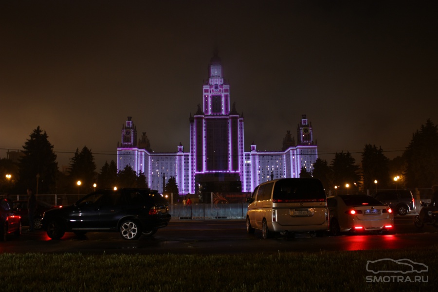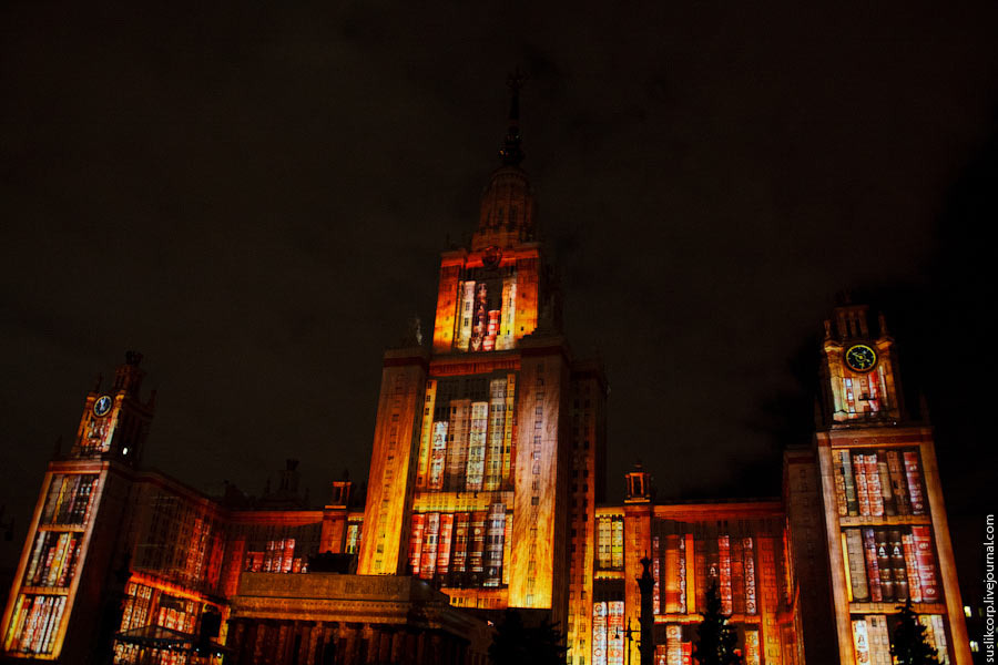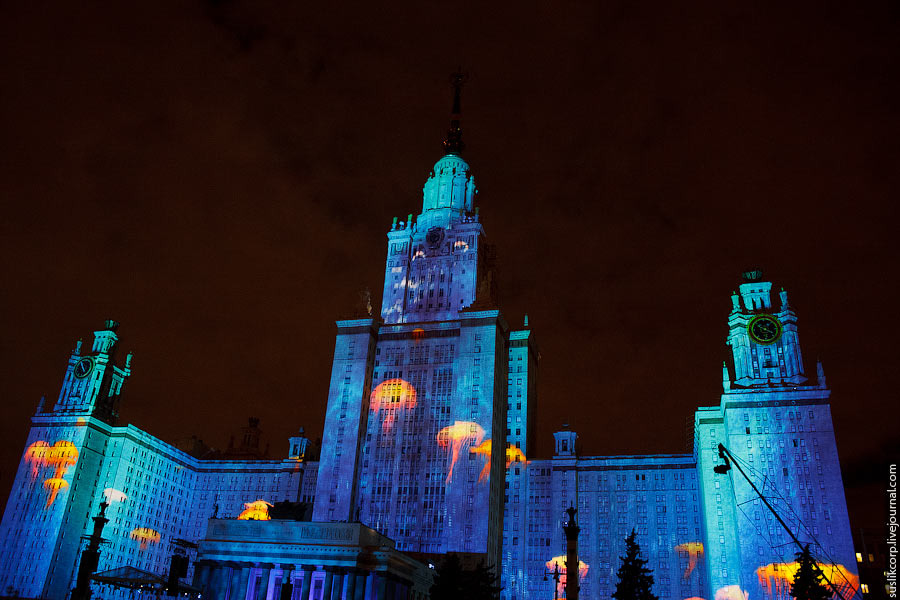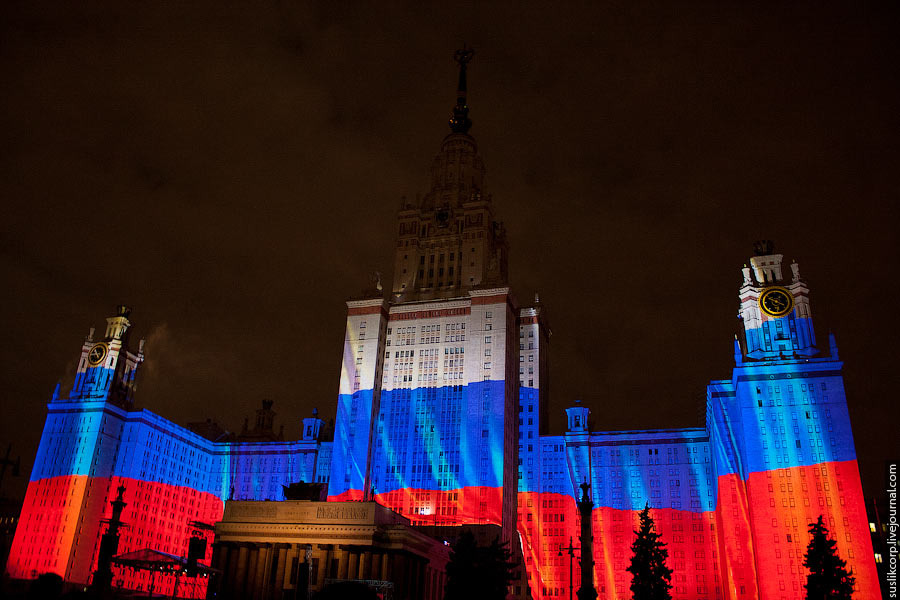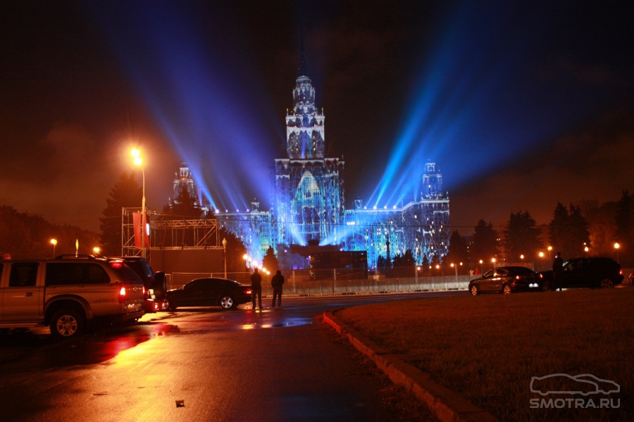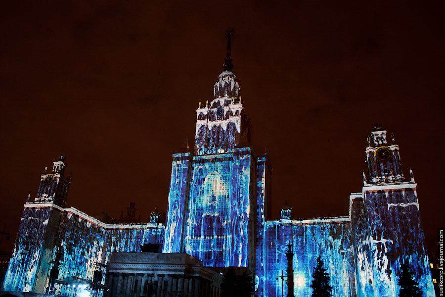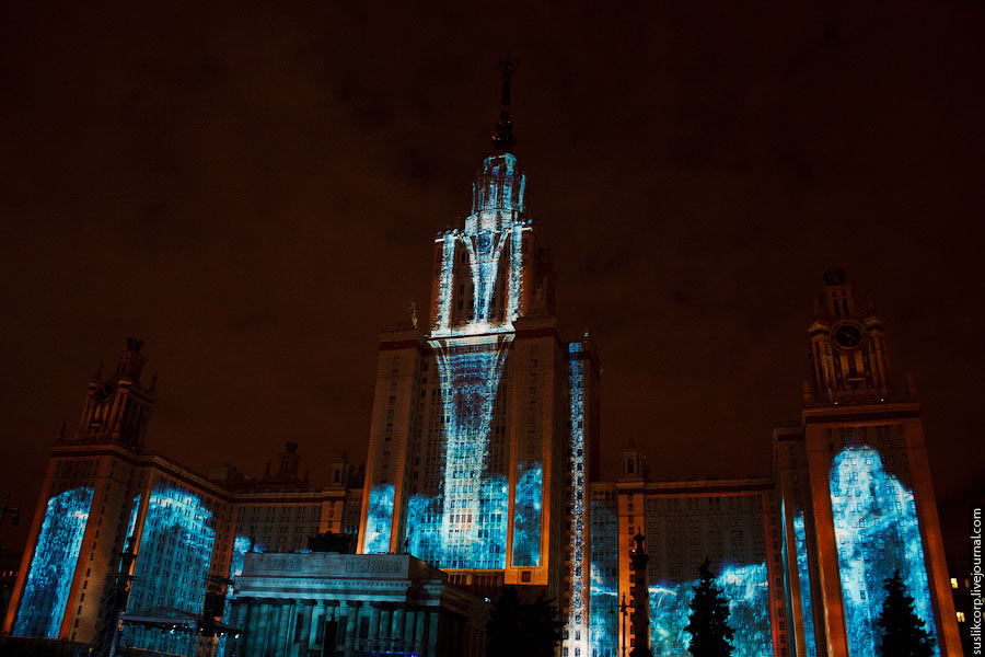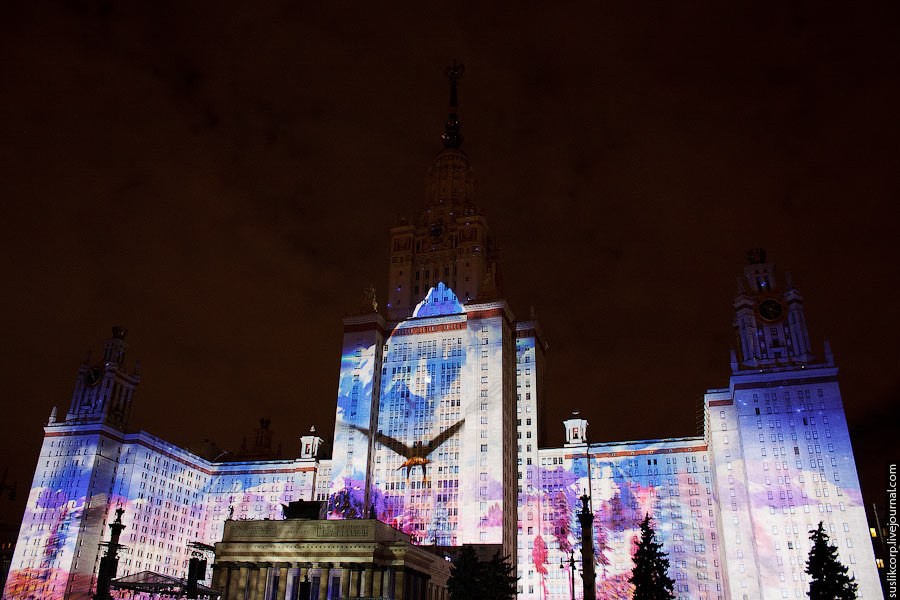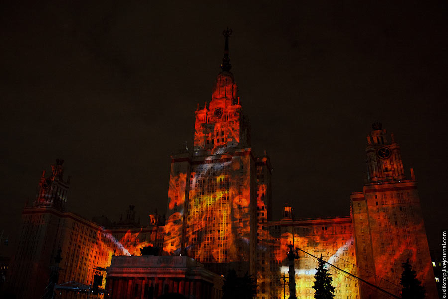 Например, так: чтобы всем зрителям от здания МГУ до Смотровой площадки было не только одинаково хорошо видно, но и равно качественно слышно, было задействовано 12 линий акустики (так называемая "звуковая задержка"), для чего, в свою очередь, возведено более 2 тысяч кубометров железных конструкций весом более миллиона килограмм!