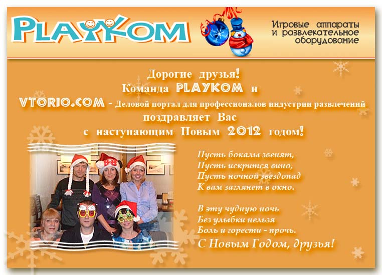 Пользуясь случаем, мы хотим ещё раз поздравить Вас с наступающим Новым годом и пожелать быть активными пользователями нашего портала. Профессионалы Индустрии Развлечений-народ особый, креативный, озорной, весёлый и дружный! Давайте знакомиться и дружить на ВТОРИО! Нам очень хочется, чтобы Вы всё-таки начали общаться и делиться опытом! Успехов Вам в будущем году, пусть он станет лёгким для бизнеса и принесёт желаемую прибыль, друзья!