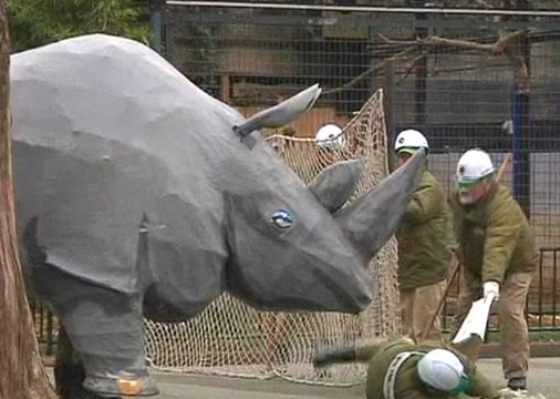 В зоопарке Уэно в Токио произошло необычное ЧП. По легенде, из клетки вырвался огромный белый носорог и попытался «прорвать оборону» сотрудников зоопарка. Настроено животное было агрессивно, но спасатели, подоспевшие по вызову хранителей зоопарка, помогли изловить носорога и вернуть в вольер. Все это произошло, конечно, в рамках подготовки зоопарка к чрезвычайным ситуациям.