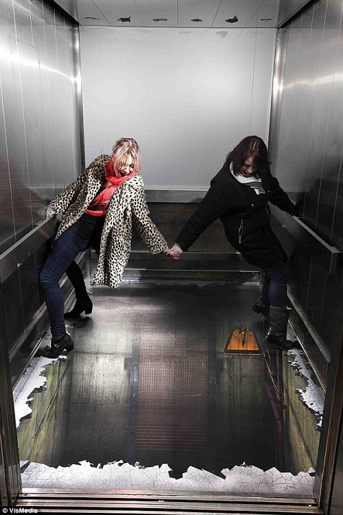 В одном из лифтов лондонского торгового центра Southside Shopping Centre пол заменили на 3D иллюзию пропасти над шахтой лифта. Ее нарисовал художник Эндрю Уокер (Andrew Walker). У ничего не подозревающих посетителей ТЦ реклама вызывала непроизвольный крик ужаса.