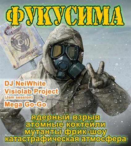 28 мая в КРК "Мегаполис" пройдет вечеринка под названием "Фукусима-party". Трехметровая афиша с подобным содержанием висит на входе в развлекательный центр. "Для Вас в эту ночь: ядерный взрыв, атомные коктейли, мутанты фрик-шоу, катастрафическая атмосфера", — информирует она посетителей заведения. Дополняет же смысл человек в белом комбинезоне и в противогазе, олицетворяющий одного из ликвидаторов аварии на АЭС "Фукусима".